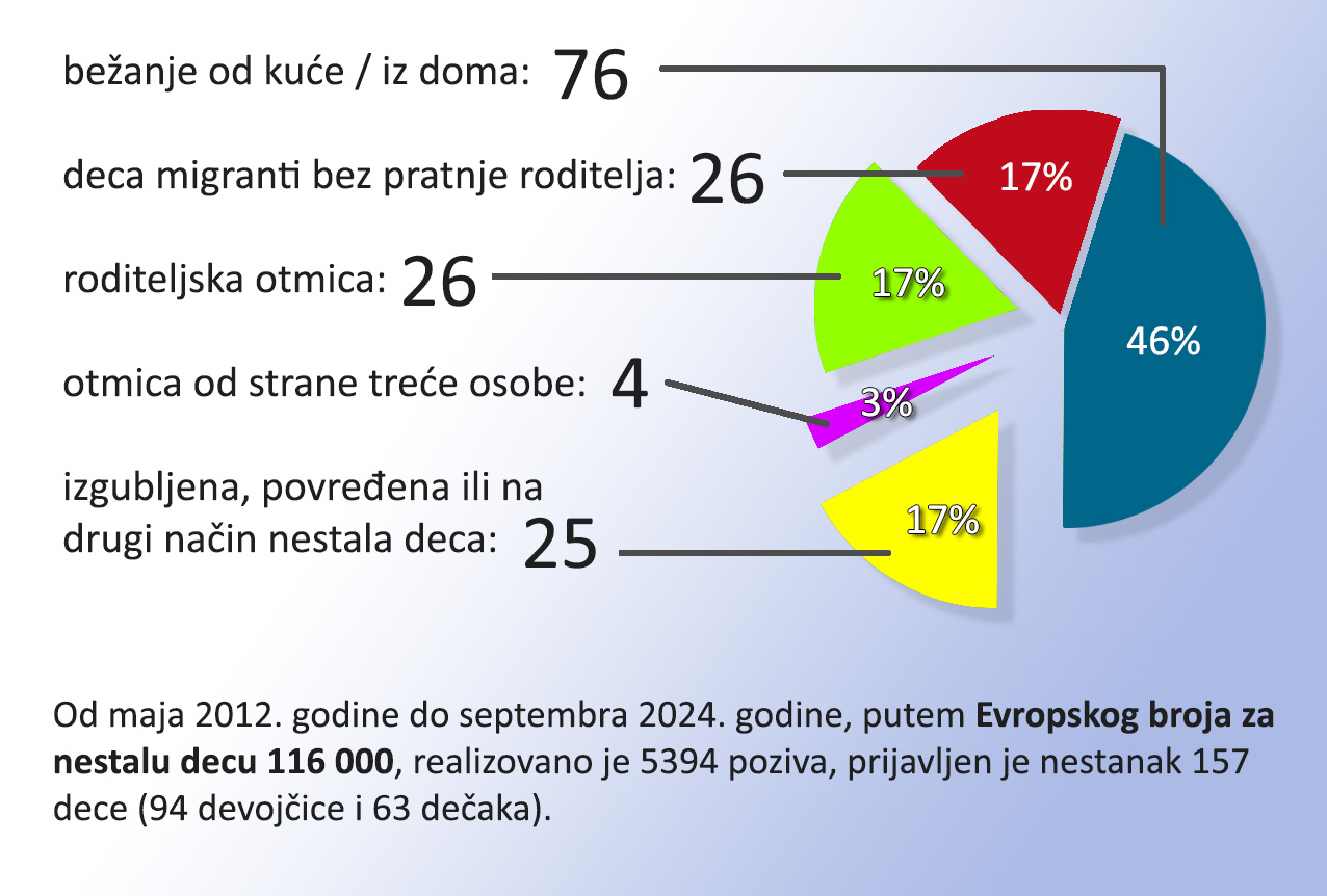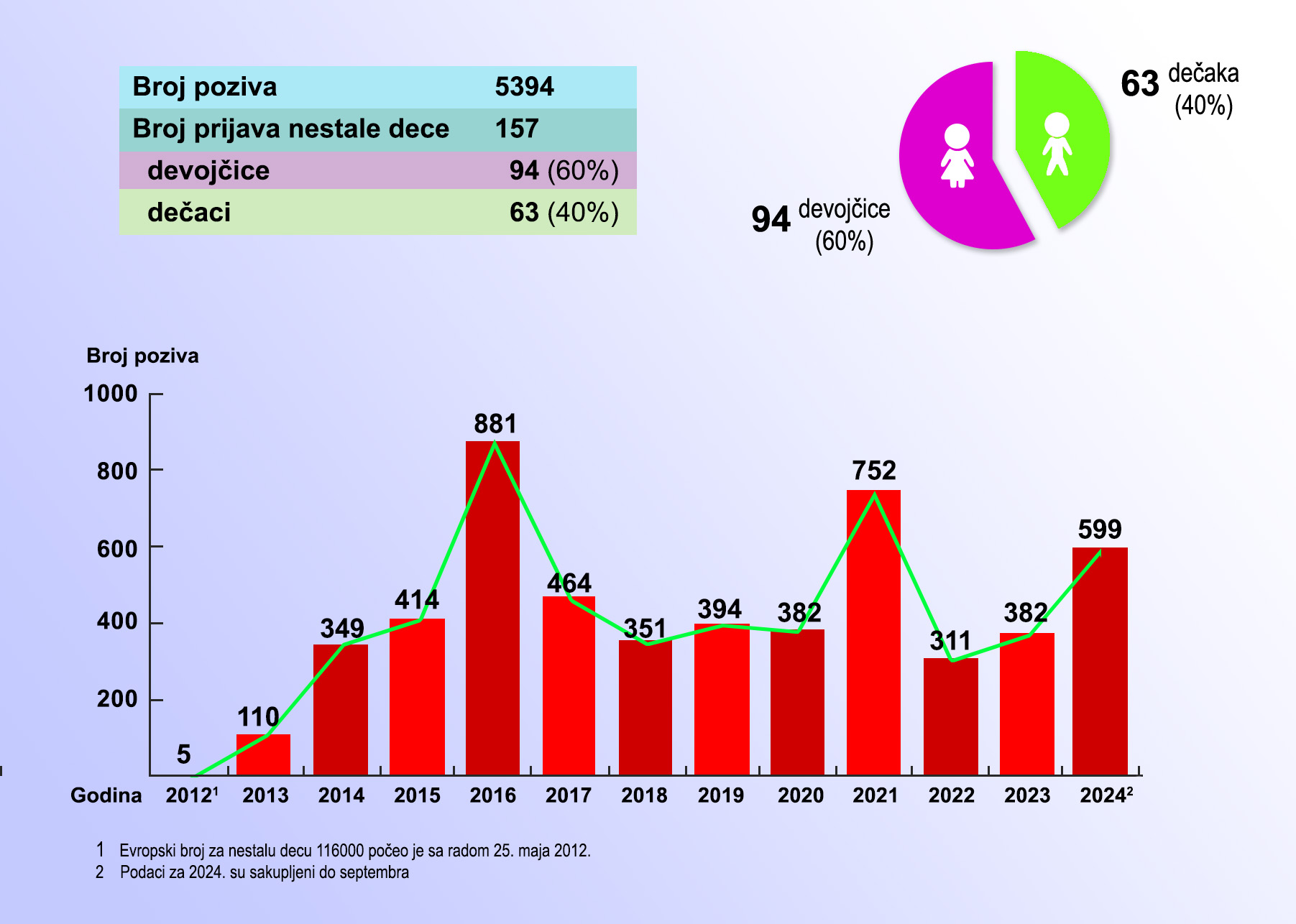 putem Evropskog broja za nestalu decu realizovano je 5394 poziva, prijavljen je nestanak 157 dece (94 devojčice i 63 dečaka).